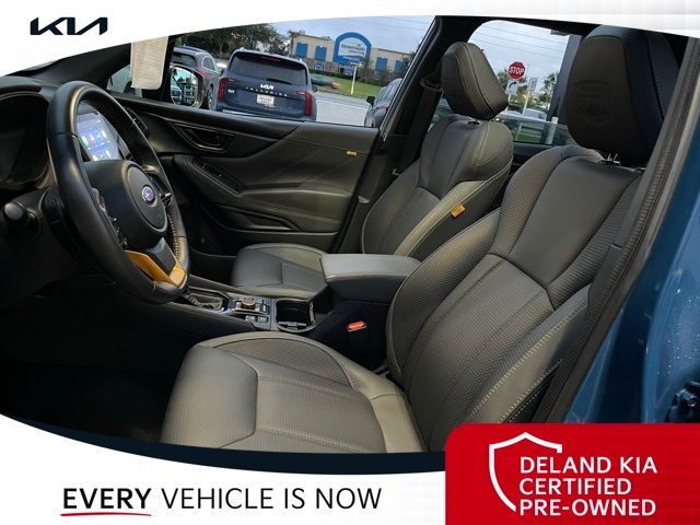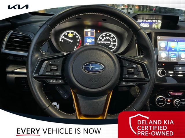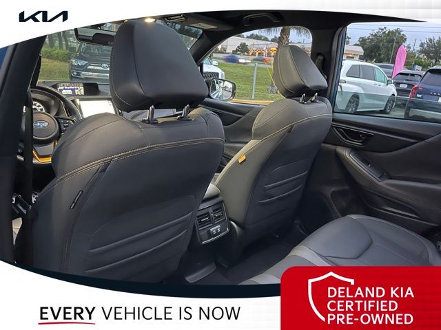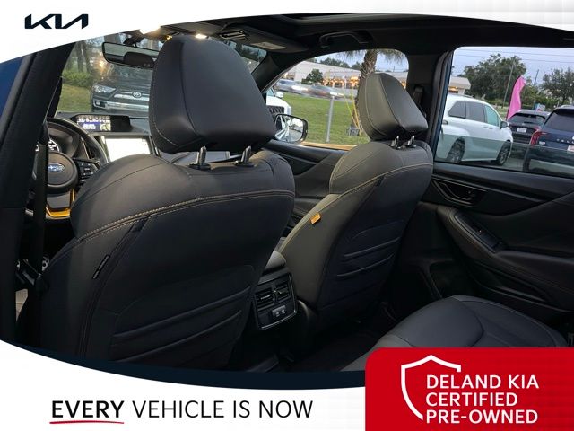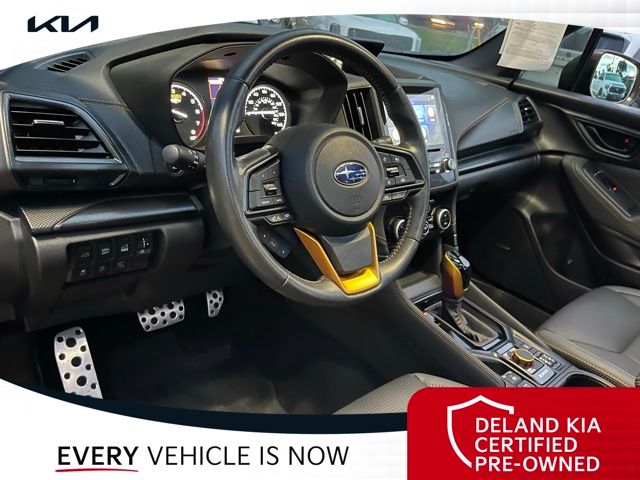 Equipped with Alloy wheels, Front dual zone A/C, Front fog lights, Heated front seats, Power driver seat, Power moonroof: Panoramic, Steering wheel mounted audio controls, 4-Wheel Disc Brakes, 4.11 Axle Ratio, 6 Speakers, ABS brakes, Air Conditioning, AM/FM radio: SiriusXM, Anti-whiplash front head restraints, Auto High-beam Headlights, Automatic temperature control, Brake assist, Bumpers: body-color, CD player, Driver door bin, Driver vanity mirror, Dual front impact airbags, Dual front side impact airbags, Electronic Stability Control, Emergency communication system: STARLINK Safety and Security (Subscription Required), Exterior Parking Camera Rear, Four wheel independent suspension, Front anti-roll bar, Front Bucket Seats, Front Center Armrest, Front reading lights, Fully automatic headlights, Heated door mirrors, Heated Front Bucket Seats, Illuminated entry, Knee airbag, Leather Shift Knob, Low tire pressure warning, Occupant sensing airbag, Outside temperature display, Overhead airbag, Overhead console, Panic alarm, Passenger door bin, Passenger vanity mirror, Power door mirrors, Power steering, Power windows, Radio data system, Radio: Subaru Starlink 8.0" Multimedia Plus System, Rear anti-roll bar, Rear seat center armrest, Rear window defroster, Rear window wiper, Remote keyless entry, Roof rack: rails only, Security system, Speed control, Speed-sensing steering, Split folding rear seat, Spoiler, STARLINK/Apple CarPlay/Android Auto, Tachometer, Telescoping steering wheel, Textured StarTex Upholstery, Tilt steering wheel, Traction control, Trip computer, Turn signal indicator mirrors, Variably intermittent wipers, and Wheels: 17" x 7.0 J Matte Black Finish Alum-Alloy.