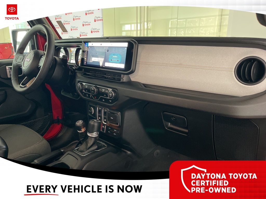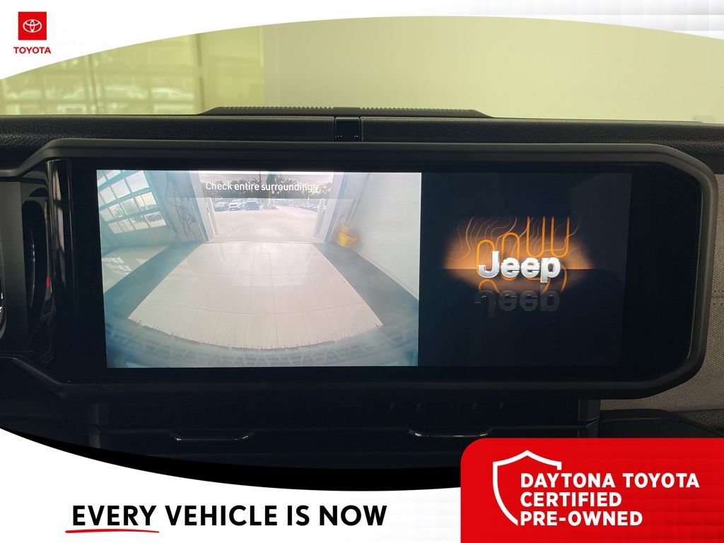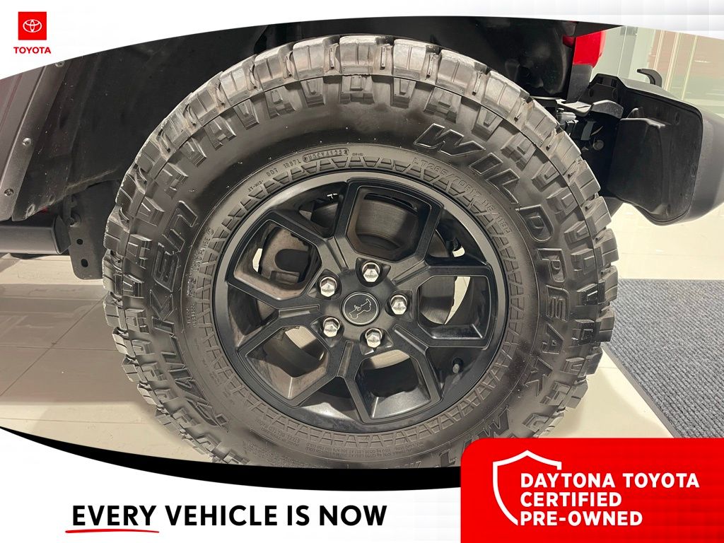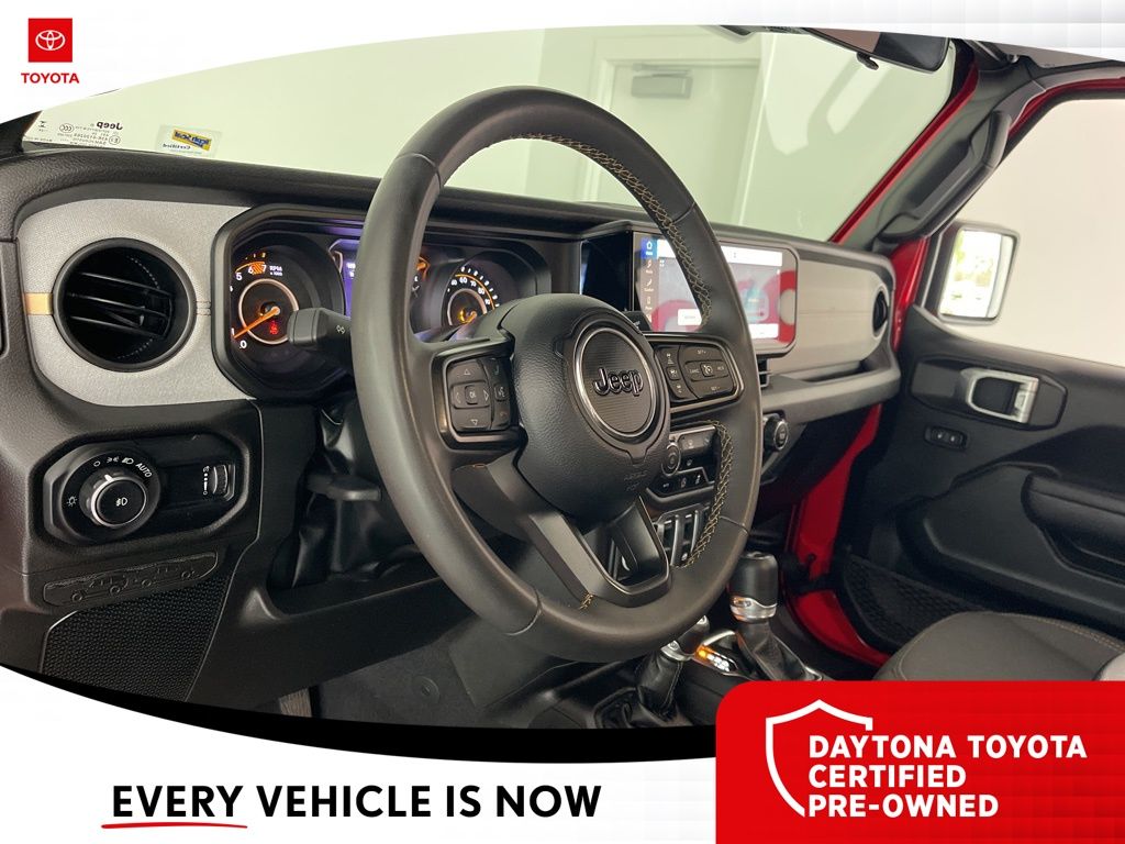 The exterior of the Wrangler Willys exudes a bold, rugged style with its Firecracker Red Clearcoat paint, Black Grille, and Injection Molded Black Rear Bumper. The interior is equally impressive, with premium wrapped steering wheel, sun visors with illuminated vanity mirrors, and a 12.3-inch Uconnect 5 display that seamlessly integrates your smartphone via Apple CarPlay and Android Auto.